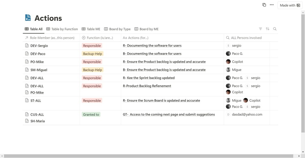 Manage all types of tasks (functions) for each member or team. Register who is responsible or act as a backup-helper for each function.